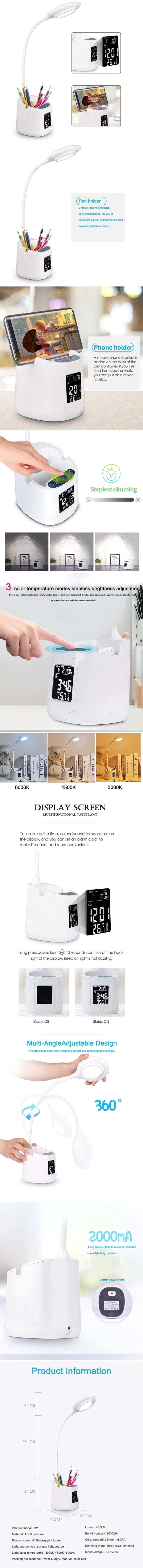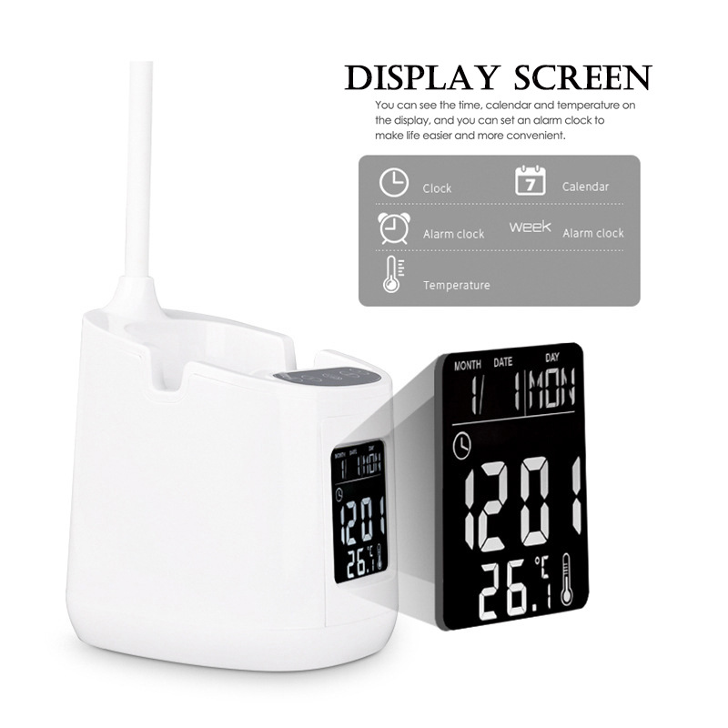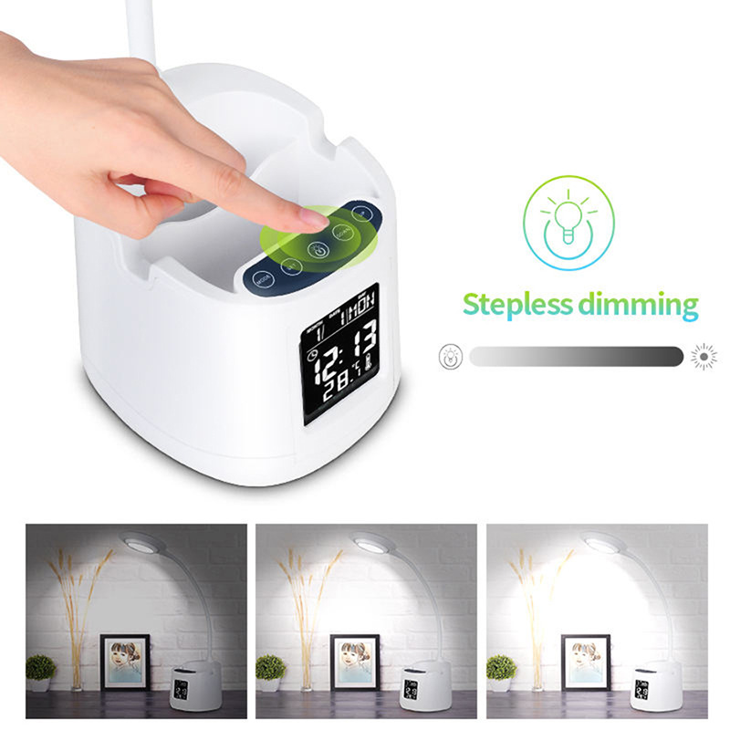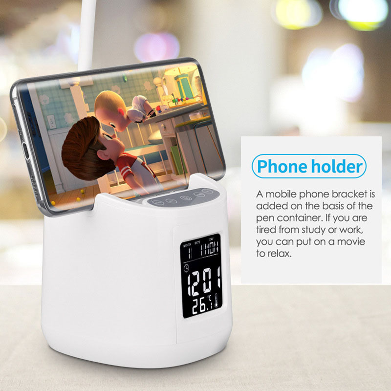 Portable LED Table Lamp with Digital Clock & Penholder & Phone Bracket